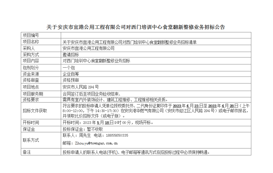 關于安慶市宜港公用工程有限公司對西門培訓中心食堂翻新整修業務招標公告
