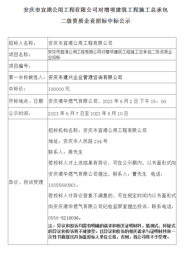 安慶市宜港公用工程有限公司對增項建筑工程施工總承包二級資質企業招標中標公示