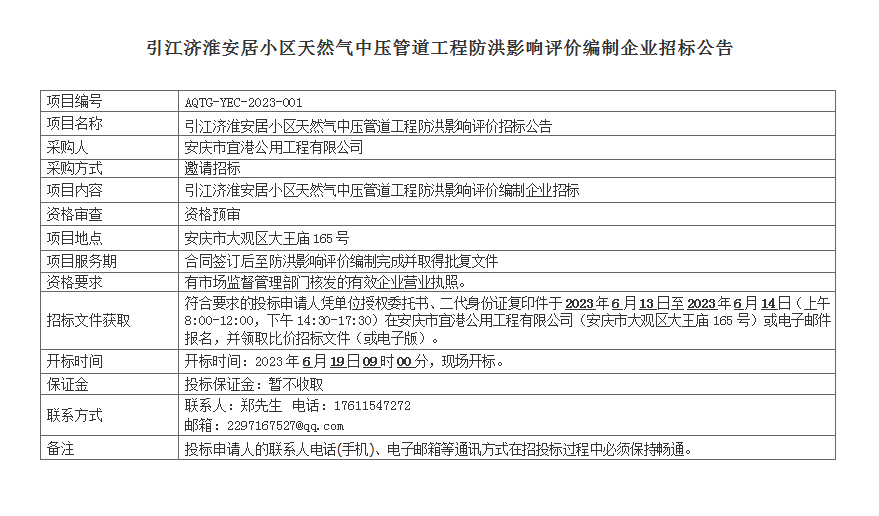 引江濟淮安居小區天然氣中壓管道工程防洪影響評價編制企業招標公告
