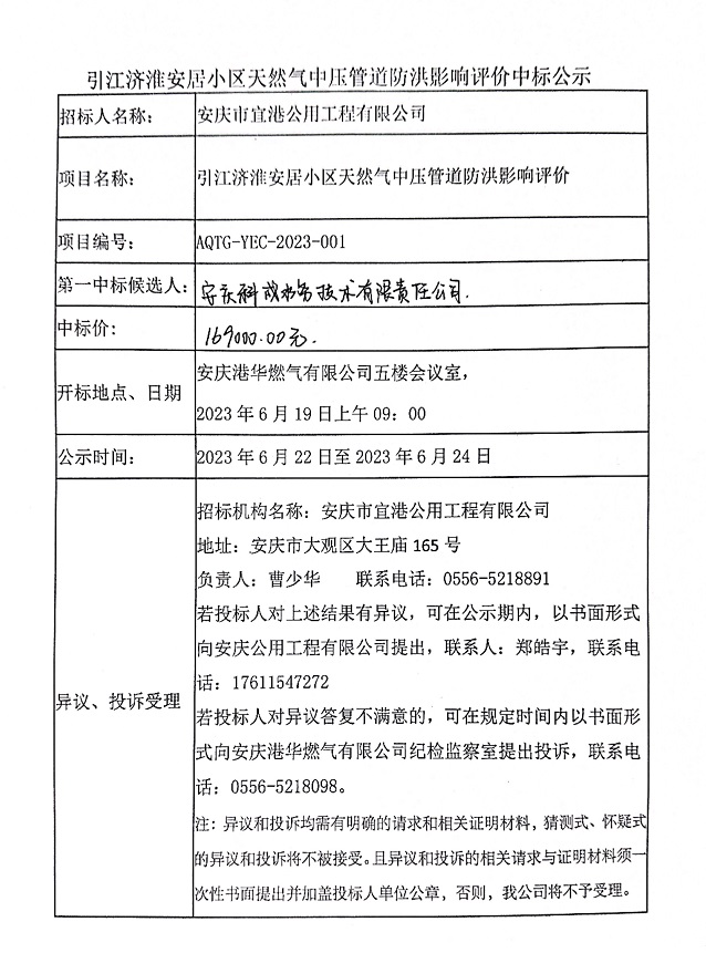 引江濟淮安居小區天然氣中壓管道工程防洪影響評價中標公示