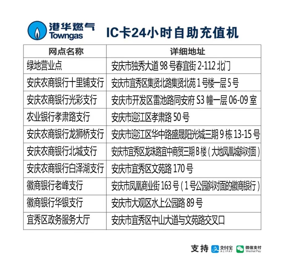 目前我公司支持交通銀行、徽商銀行、郵政儲蓄銀行、工商銀行、農業銀行和浦發銀行的網上銀行和手機銀行,以及移動“中國移動”、電信“翼支付”、我公司微信公眾號和在“微信”-“生活繳費”、“支付寶”-“生活繳費”中查詢燃氣費并繳納欠費或預存氣費。