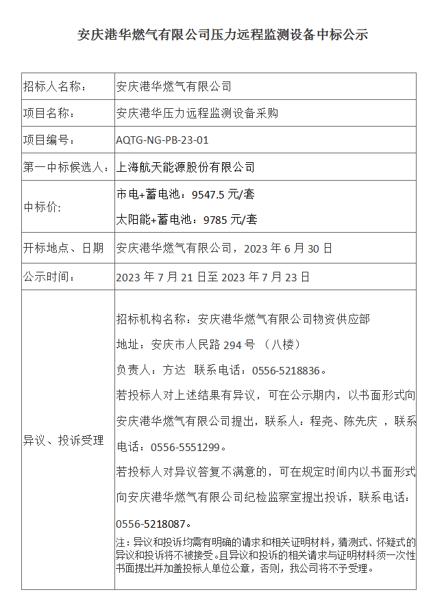安慶港華燃氣有限公司壓力遠程監測設備中標公示