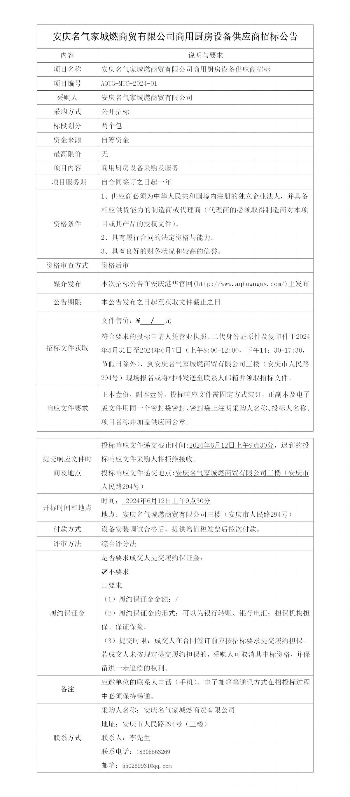 安慶名氣家城燃商貿有限公司商用廚房設備供應商招標公告