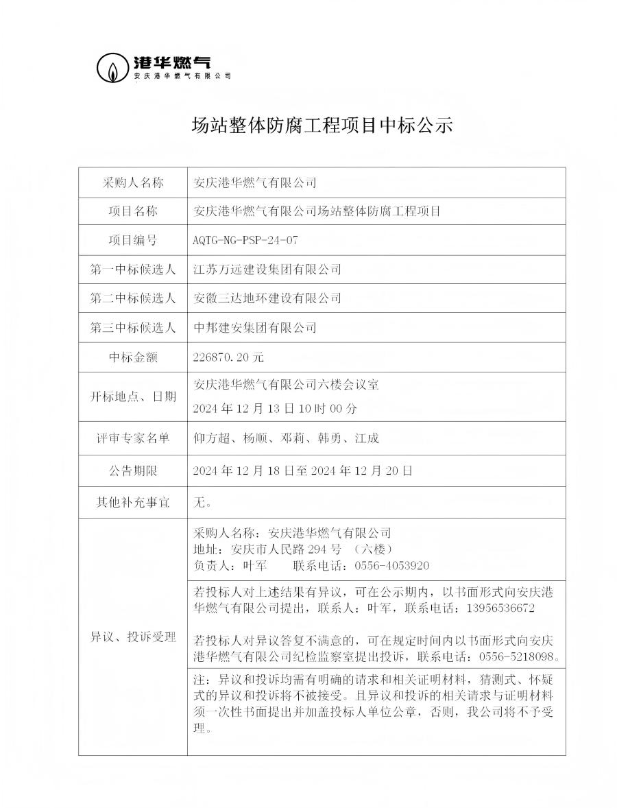 場站整體防腐工程項目中標公示