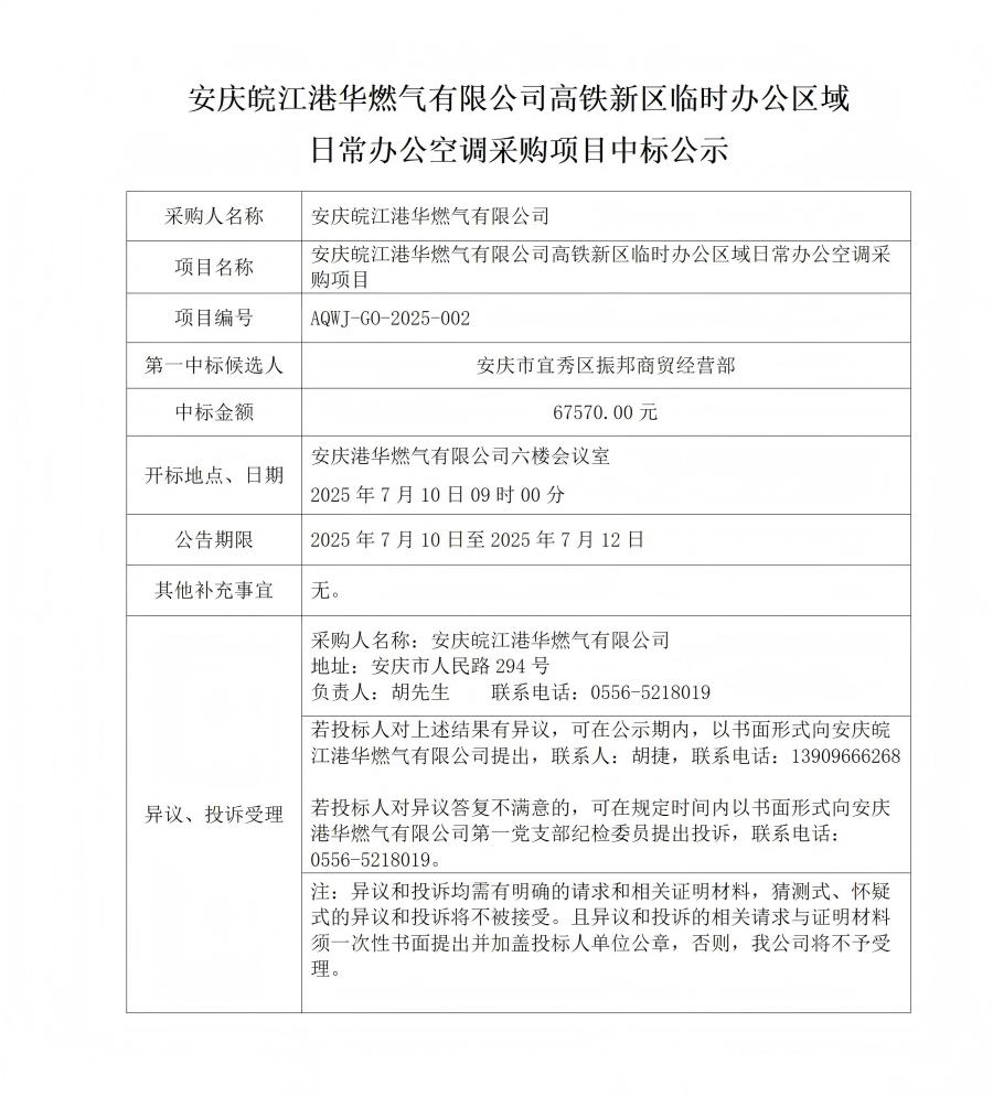 安慶皖江港華燃氣有限公司高鐵新區臨時辦公區域 日常辦公空調采購項目中標公示