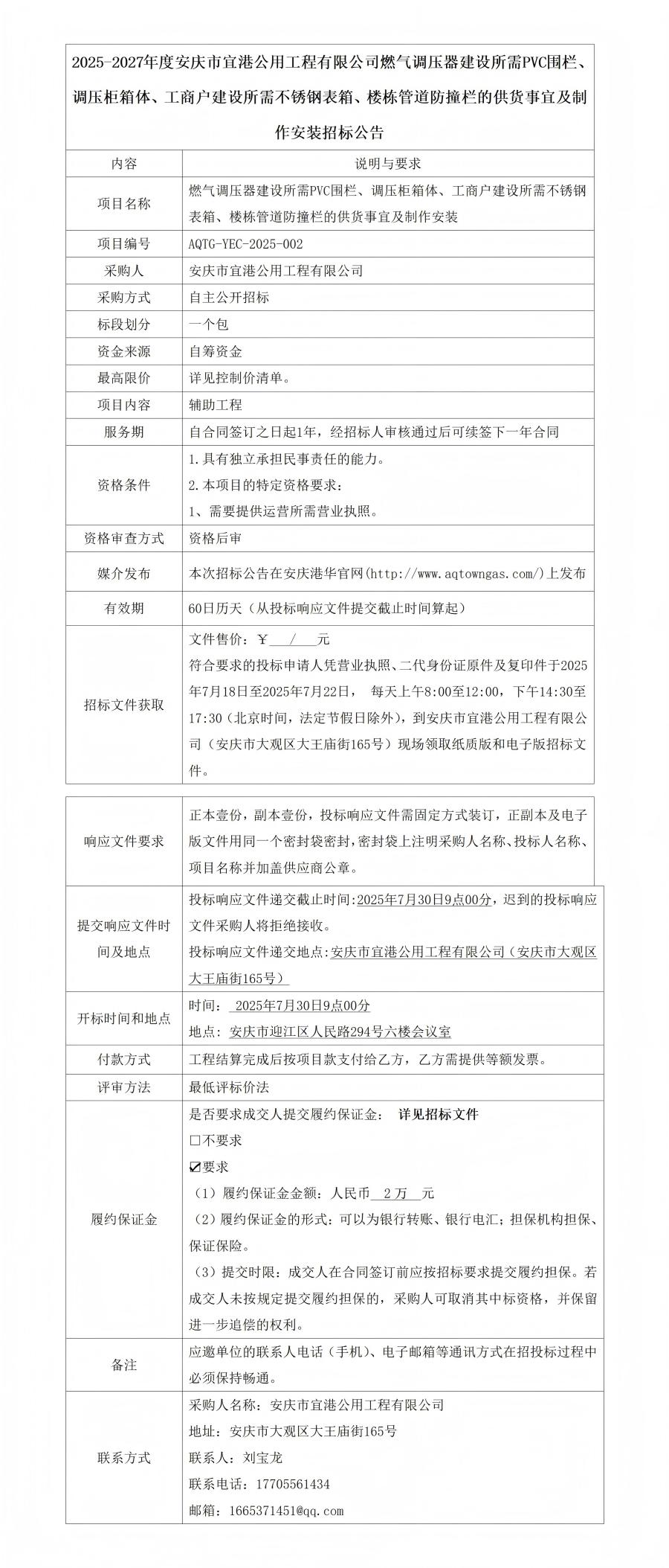 2025-2027年度安慶市宜港公用工程有限公司燃氣調壓器建設招標公告