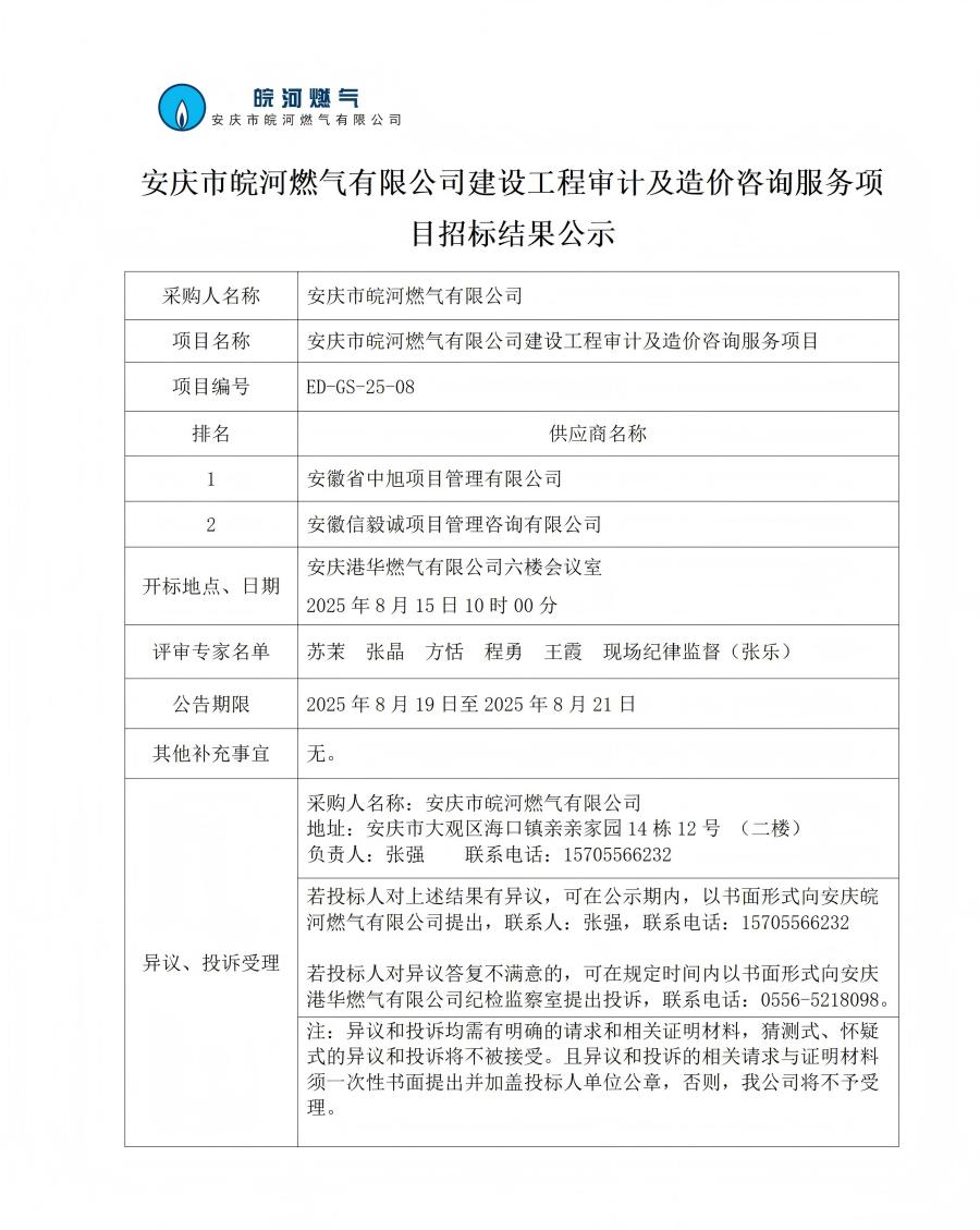 安慶市皖河燃氣有限公司建設工程審計及造價咨詢服務項目招標結果公示