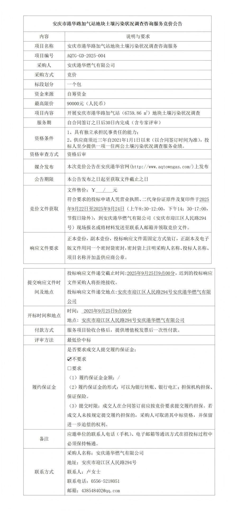 安慶市港華路加氣站地塊土壤污染狀況調查咨詢服務競價公告