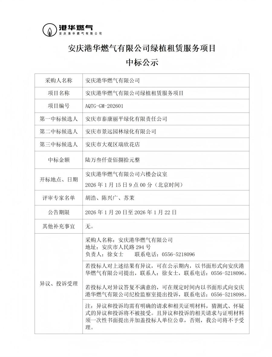安慶港華燃氣有限公司綠植租賃服務項目中標公示